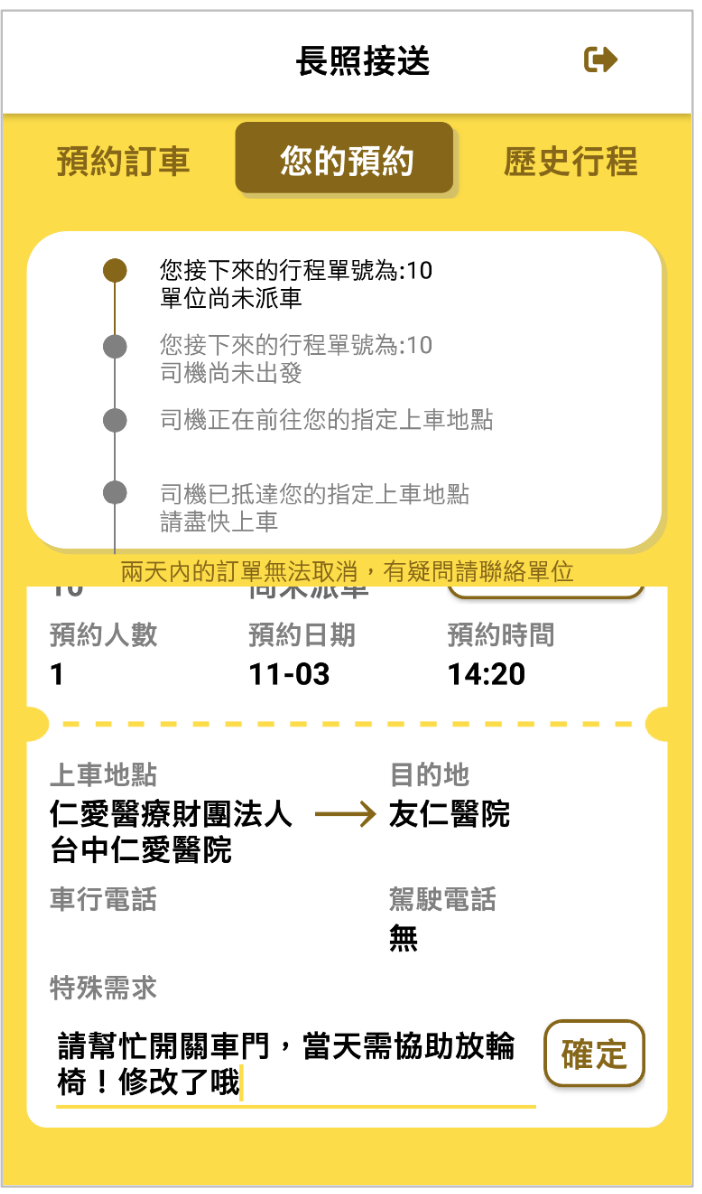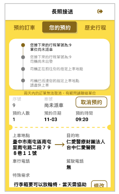 家屬或使用者可在預約時填寫備註,如請司機協助開門、提醒拿藥等,使乘車更貼心